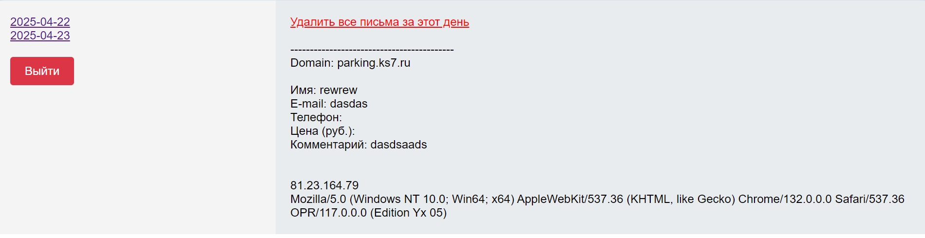 - К сожалению, многие почтовики не только отправляют письма в спам, но и вообще блокируют их доставку. Особенно это актуально для Яндекс.Почты. Часто потеря сообщения с парковки сравнима со срывом сделки по продаже домена. Поэтому в скрипте предусмотрена система резервного хранения сообщений. Все сообщения хранятся в папке mail с сортировкой по дням. Т. е. все сообщения за один день хранятся в одном файле.