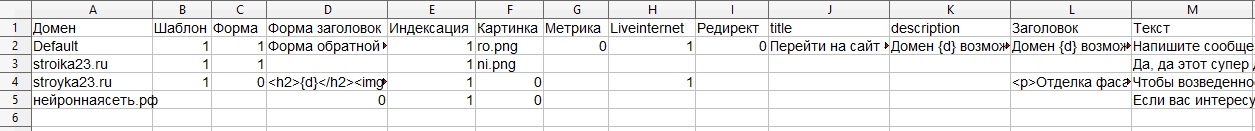 3. Первая строка в таблице – это название столбцов, вторая – настройки по умолчанию. Значения по умолчанию применяются, если домен добавлен на хостинг и привязан к папке, но не внесен в таблицу. Т. е. если вам нужен одинаковый шаблон для всех доменов парковки, вам достаточно только прописать строку default. Добавлять все домены в таблицу не нужно. Также не надо добавлять все домены в таблицу, если вам, например, надо кастомизировать всего 10 из 100 доменов. Добавьте эти 10 доменов в таблицу и пропишите им параметры. К остальным доменам, которые не будут добавлены в таблицу, будут применены дефолтные настройки.